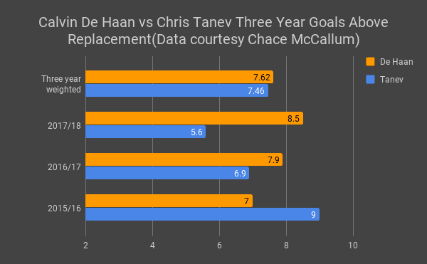 De Haan’s value shines through this lens, finishing among the top-50 NHL defencemen in each of the past three seasons. His GAR contribution during that span bests all Canucks’ defencemen including analytics darling Chris Tanev.