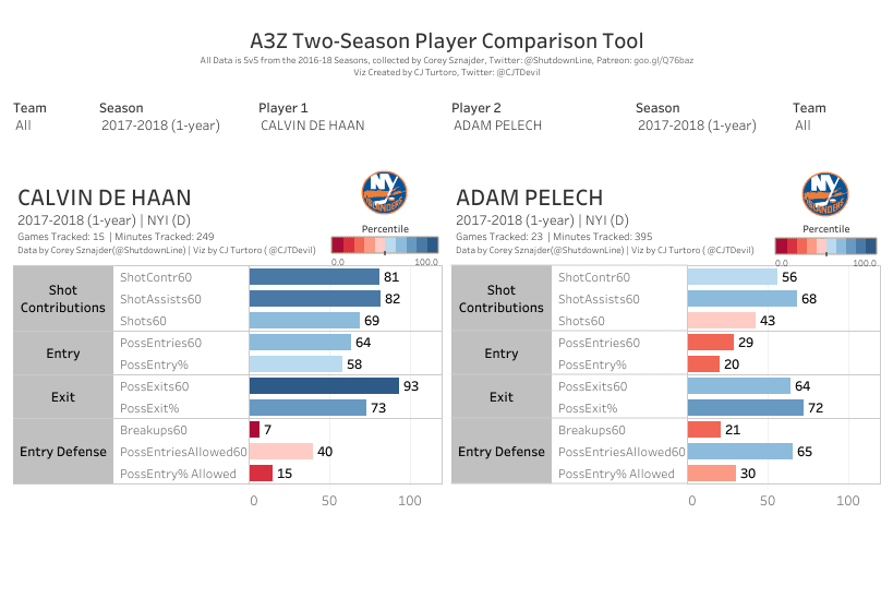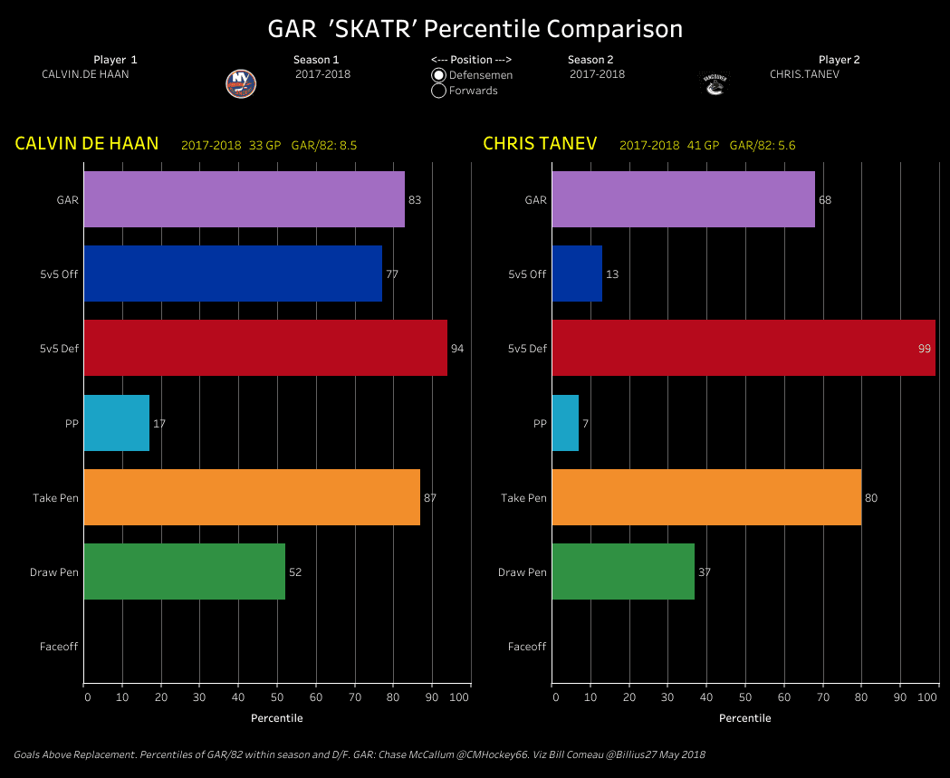 Deployment is the key difference with Tanev matched against the opposition’s best forwards, though De Haan is among the 67th percentile of defenders for the quality of competition as well. He also stands out as the driver for his pairing’s success when looking at microdata tracked by The Athletic’s Corey Sznajder.
