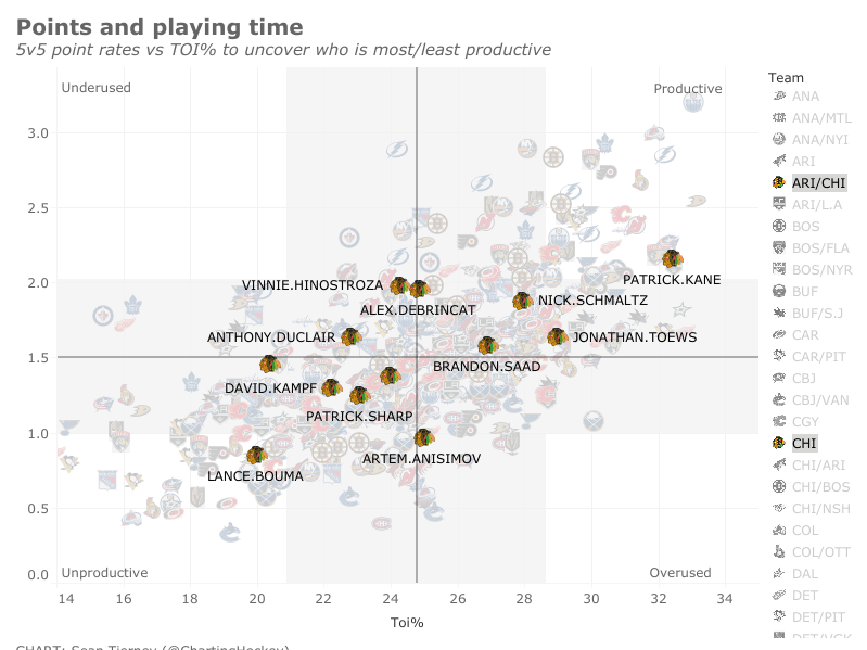 Duclair was ahead of Brandon Saad and tied with Jonathan Toews with 1.64 even-strength points per hour. Both Saad and Toews had poor seasons relative to their elite standards, but it’s encouraging nonetheless to see Duclair producing something.