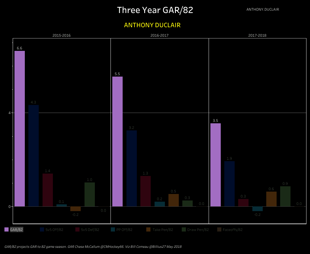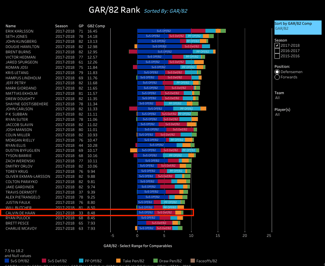 I’ve used the goals above replacement (GAR) model for a while now, and it’s for good reason. GAR is a composite metric that combines various on-ice stats and raw production to evaluate a player’s ability to drive two-way play at both even-strength and the powerplay. The final result is a number of goals by which a player improves his team’s goal differential relative to a replacement level player.