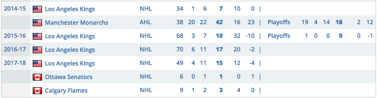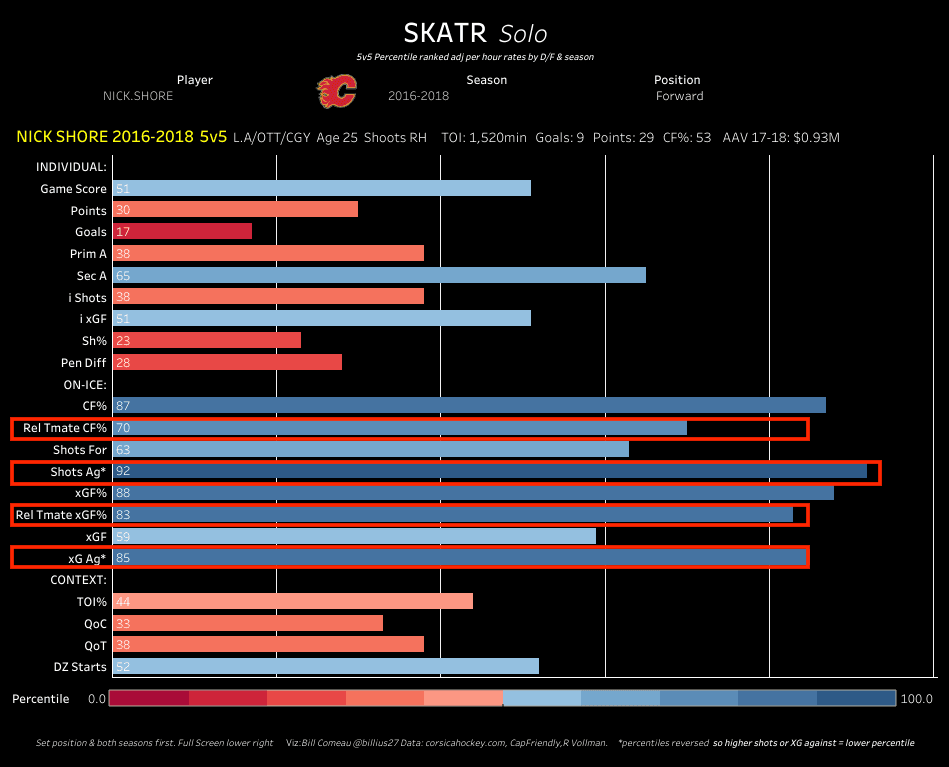 Shore is among the top 20th percentile of NHL forwards since the 2014-15 season when looking at the rate at which he generates shot assists(SA60), danger zone shot assists(DZSA60) and expected assists(ixA60).His lack of production simply boils down to the linemates with which he’s played. No offence to his most common teammates this season with the Kings in Trevor Lewis and Andy Anderoff, but neither of those guys are capable of regularly converting on high danger scoring chances. Give Shore competent top-nine players on his wings and I’m sure he’d show a lot better than his track record to date might indicate.
