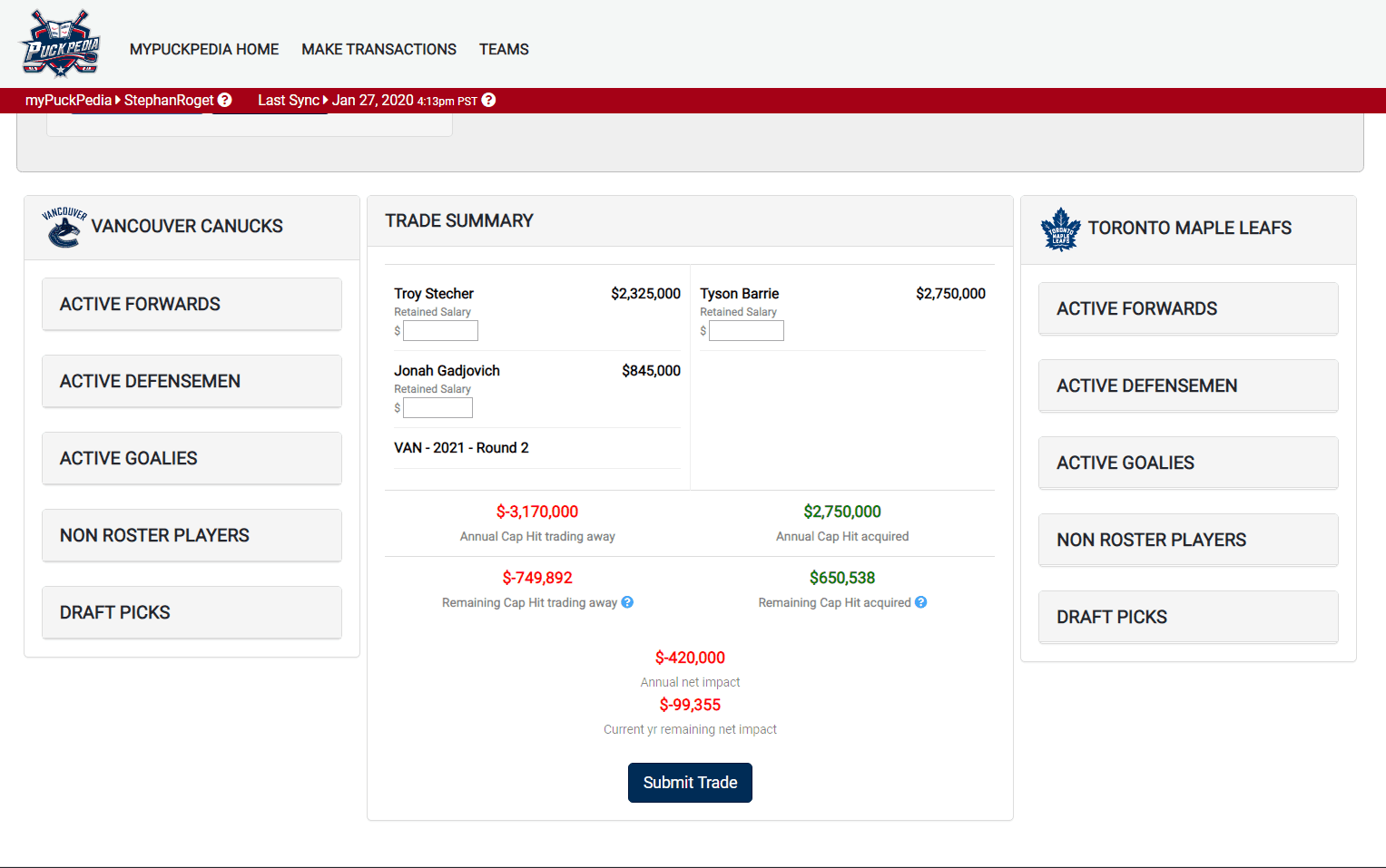 This trade also works cap-wise and saves money beyond this season – unless, of course, the Canucks choose to re-sign Barrie, in which case they wouldn’t be bringing back Chris Tanev. It also provides what has to be considered a massive upgrade on Stecher, and a player that very well could be the best defender on the Canucks’ right side. If Toronto has truly soured on Barrie and really does have an interest in Stecher, Vancouver would do well to secure a deal that looked something like this – even if it is the premium option.