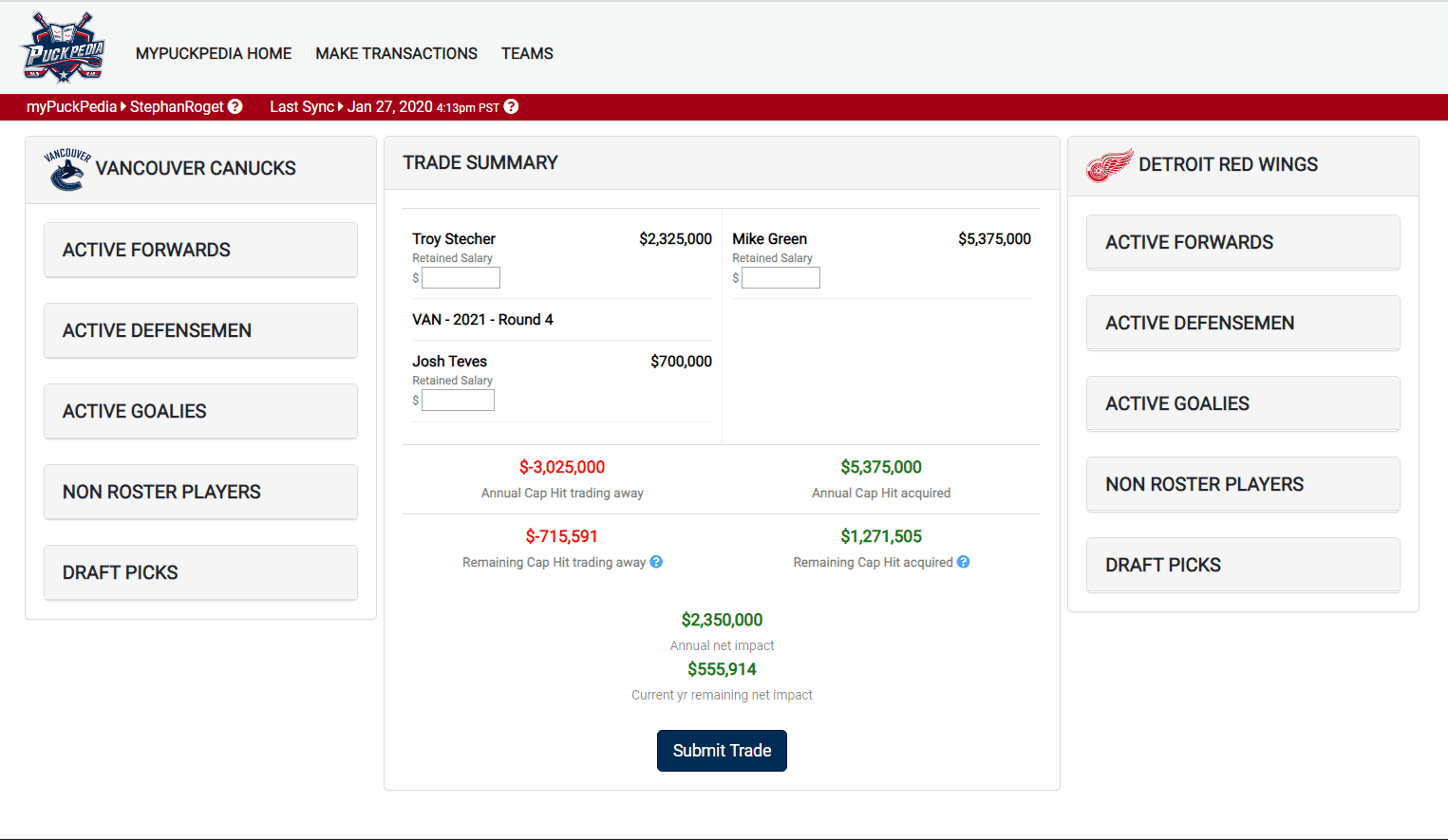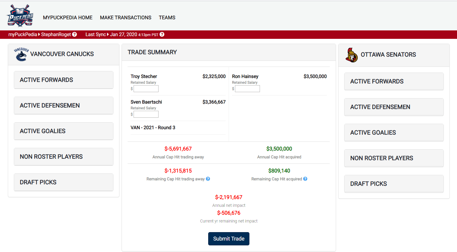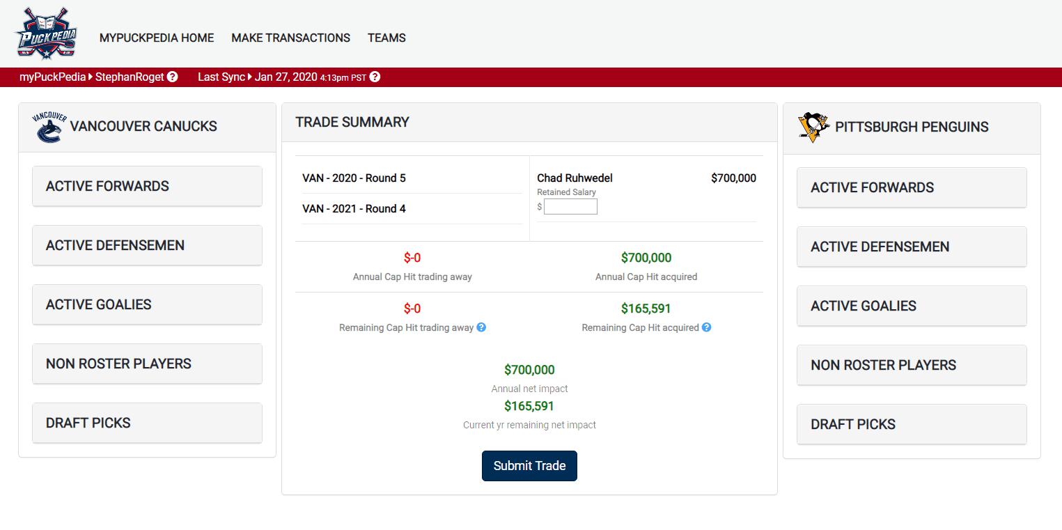 This trade works cap-wise and has no implications beyond this year with Hainsey highly unlikely to re-sign. As was mentioned before, Hainsey looks like a sure-fire upgrade on Stecher for the rest of this season at least – and that’s all the Canucks need out of him. This would be a budget-conscious move.