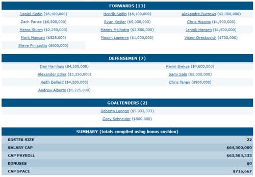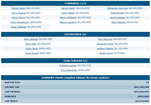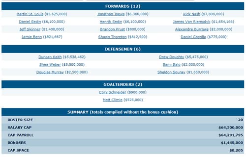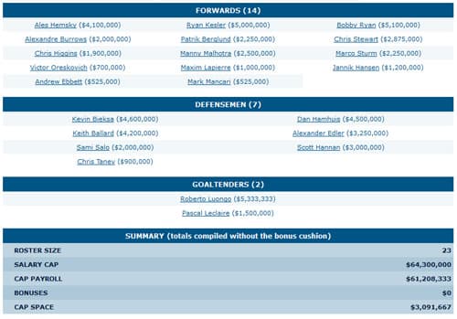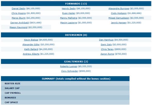 I don’t know why the cap space summary didn’t work on this one, but it’s a fairly simple change: Hodgson flips to wing and supplants Raymond alongside Kesler. The third line retains Manny at center flanked by some aging warriors and Hansen takes a demotion to play alongside Lapierre and dark horse Archibald. Not sure where Oreskovich went (you’d assume he’s a shoe-in without Torres around) but whatever. It’s nothing exciting, but certainly probable by the time training camp ends.