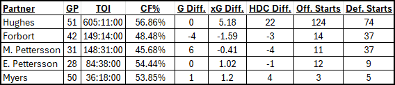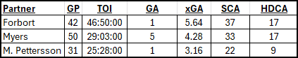 Most commonly sharing the ice with Forbort, Pettersson, and Myers, only seven goals were scored with him on the ice and paired with any of those three. The penalty killing duo of M. Pettersson and Hronek was imposing. Running an expected goals against number of only 3.16, nine high danger chances against, and only one actual goal against are all great underlying numbers and results. The sample size for that pairing is smaller than with his more common partners of Forbort and Myers, but that should not be the case in the upcoming season.
