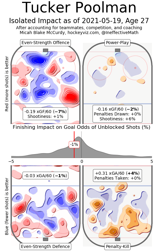 Benning told the media that he believes Poolman can do a lot of the things that Chris Tanev can do. One thing is for sure, he doesn’t look like he’s going to put up a lot of points. I actually had a laugh-out-loud moment when I saw that he had zero goals and one assist in 714 minutes of ice time over 39 games last season. If his playstyle matches his analytic profile and counting stats, he’s going to pass the puck to Rathbone and then sit in the defensive zone in a reverse cherry-picker role.