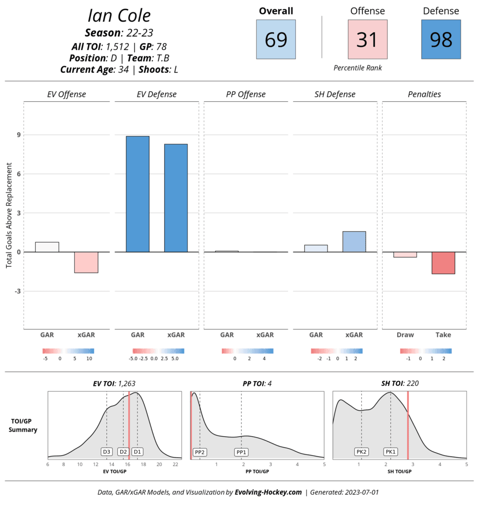 Cole has spent the last two seasons on one-year contracts in Carolina and Tampa Bay, posting 19 and 17 points respectively. Cole spent the majority of 2022-23 on a pairing with Erik Cernak, playing over 600 minutes at even strength and posting an Expected Goals For percentage of 54.13, among the highest of any regular Lightning defensive group.