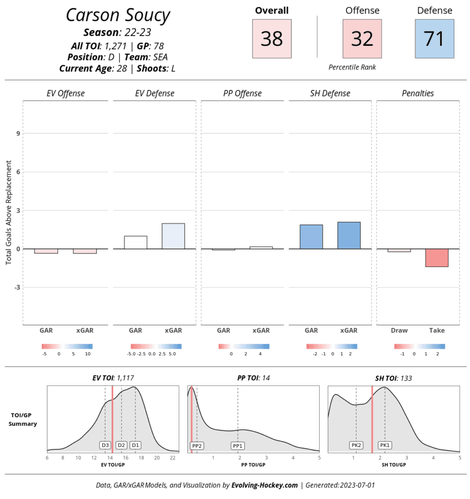 Soucy is a big defenceman who plays a heavy game with decent numbers in his own end at the cost of any major offensive contributions. But while he’s been brought in to help stabilize the penalty kill, the most glaring issue with Soucy is how often he’s the cause of his team landing on the PK in the first place, earning 68 penalty minutes with the Kraken last season.
