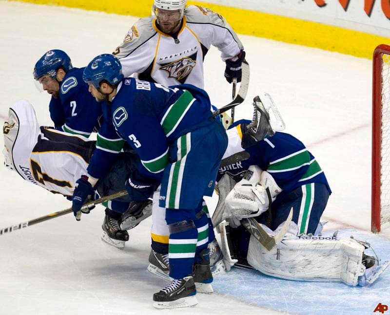 Kevin Bieksa and Dan Hamhuis: just a couple of guys who know how to clear the crease.