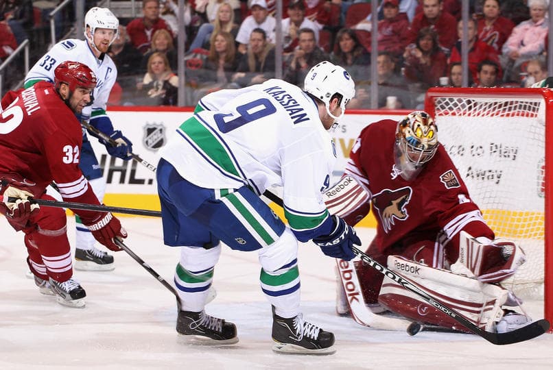 Henrik Sedin (top left) is probably thinking "don’t you dare so much as breathe on Mike Smith, Zack."