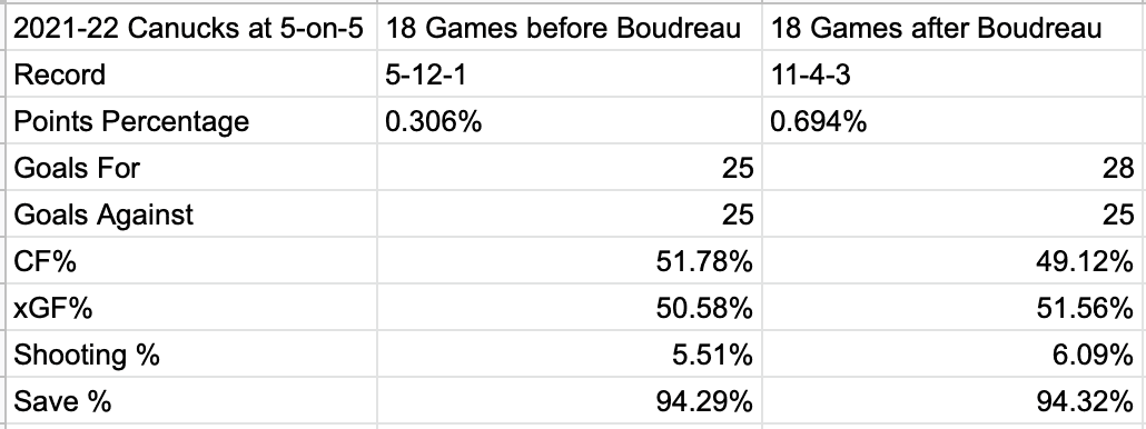 The Canucks’ record improved from 5-12-1 over the previous 18 games to 11-4-3 in the 18 games after Boudreau was hired despite many of the team’s stats at 5-on-5 staying relatively flat across the two samples.
