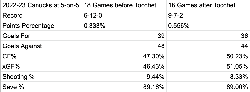 Stats from the previous 18 games before the Tocchet hire compared to the 18 after at 5-on-5. (NaturalStatTrick)