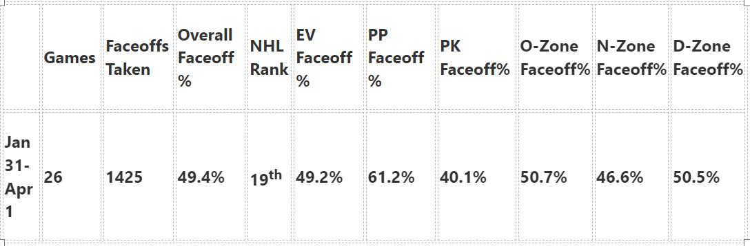 The Canucks lingered a smidgen below breaking even, and ranked around the top of the lower-third of the league in overall faceoff percentage. They were better off in some situations, like the power play, where Horvat took the bulk of the draws and the Canucks ranked third-best in the league.