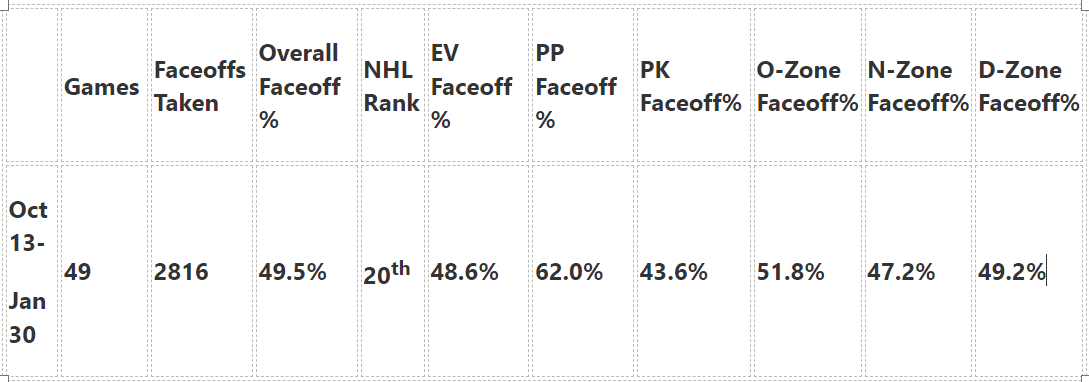 Power play faceoffs have been clipping along at almost exactly the same rate, now that JT Miller is taking the majority of them.