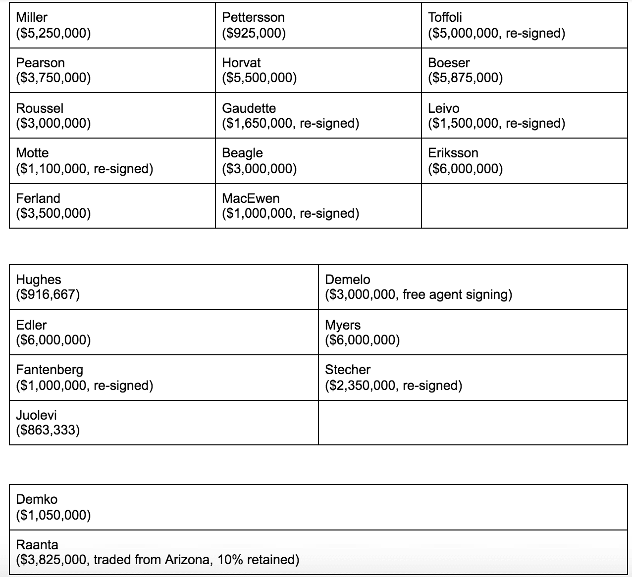 With Benn and Sutter (50% retained) off the books, the Canucks would then have just under $21.3 million in cap space to work with. If the team were to sign Demelo for $3 million and acquire Raanta (10% retained) from Arizona, that would leave Vancouver with $14.5 million left to bring back all of their other pending free agents: