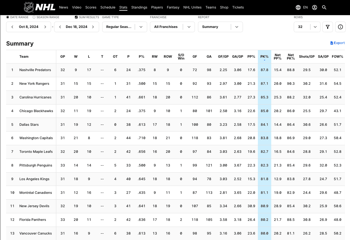 To further highlight his contributions on the penalty kill, here is where the Canucks’ penalty kill ranked across the league from the start of the season to December 18 – when Forbort played just five games: