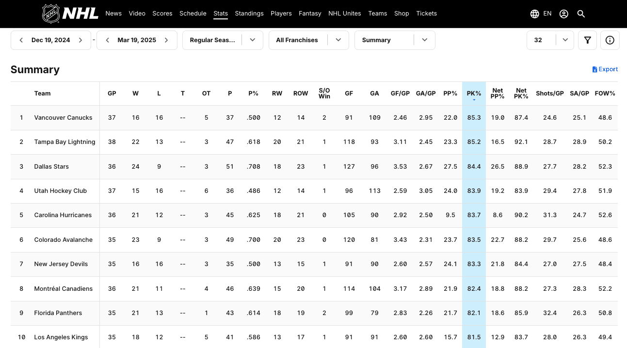 Now, here is where the Canucks’ penalty kill ranks across the league from December 19 to today – with Forbort playing all of the Canucks’ 37 games: