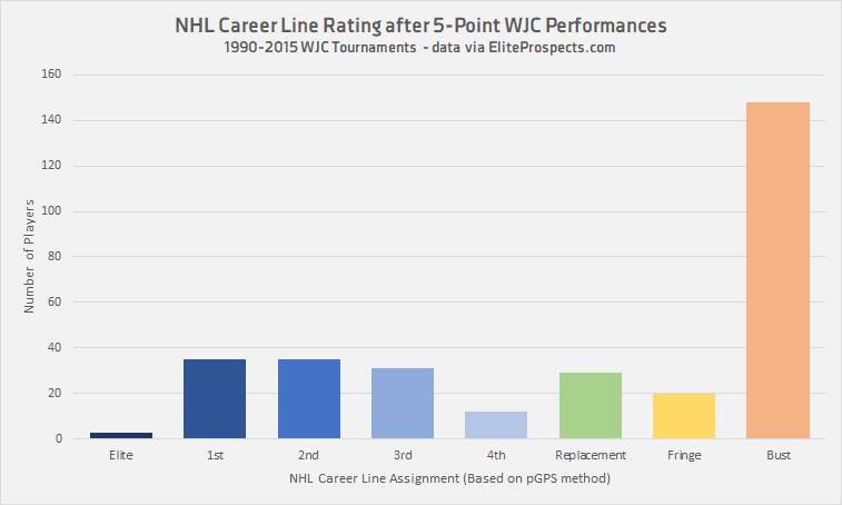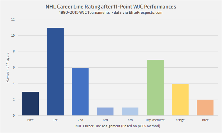 35 players scored 11 points at World Junior tournaments between 1990 and 2015, and they went on to forge a wide variety of careers. Using the line assignment system from my pGPS model, that subsection of prospects produced three elite players (including Peter Forsberg, Alex Ovechkin and Connor McDavid, who scored 11 points in 1992, 2005 and 2015 respectively), 11 First Line forwards (including Zach Parise, Phil Kessel, Vladimir Tarasenko and Evgeni Kuznetsov), six Second Line forwards and seven Replacement Level forwards (including the aforementioned Schroeder), among a smattering of other results.