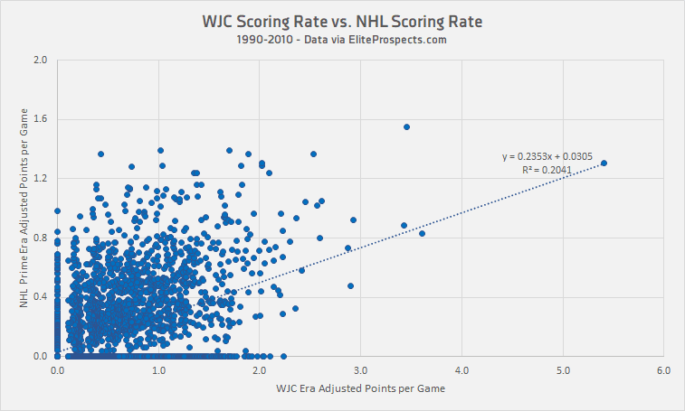 An analysis of World Junior Championship scoring data from 1990 to 2010, culled from EliteProspects.com, reveals that there is indeed a clear positive relationship between WJC scoring and eventual NHL production.