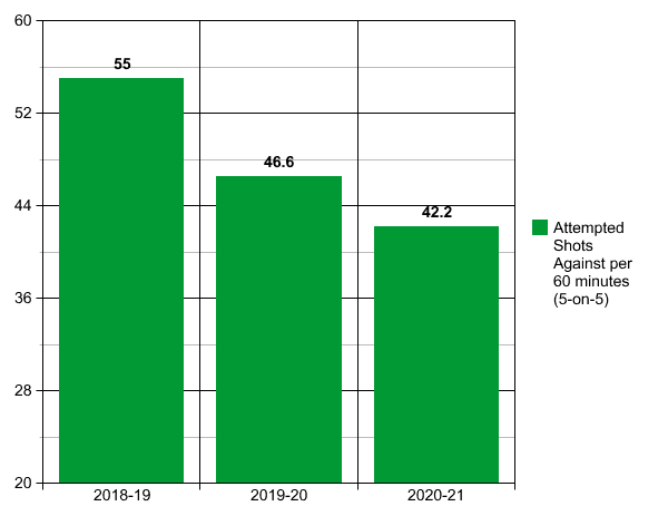 Attempted shot attempts against at 5-on-5 have steadily dropped throughout his 18, 19 and 20 year old seasons in the SHL.