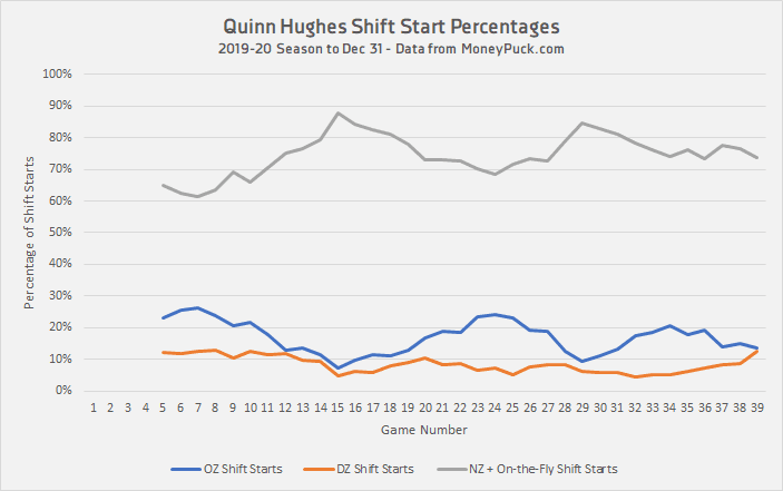 Like QoC, zone starts can be pretty overrated, but once again they provide a good indication of a coach’s trust in a player – specifically offensive versus defensive zone shift starts (which again should be taken with a grain of salt as they account for only 75-80% of shift starts). The following chart plots Hughes’ distribution of shift starts (in 5-game rolling averages) over the course of the season. The last 5-game segment has shown Hughes’ defensive zone shift starts rise to their highest rate all season – and on equal footing with his offensive zone shift starts.