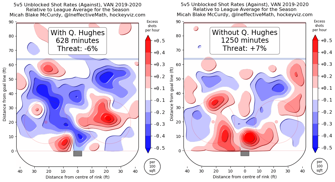 Using the threat heat maps from HockeyViz.com, we can see the stark contrast in Vancouver’s defensive zone data. While Hughes is on the ice, the Canucks are well below league average in shots against. When he’s not on the ice, they’re well above average in that regard.