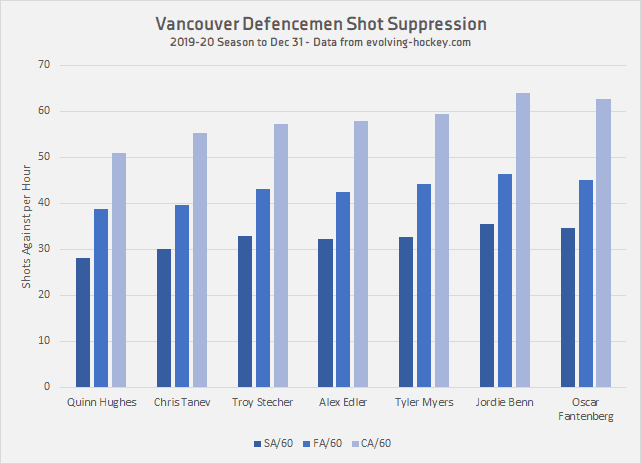 Hughes currently has the lowest shot attempts, unblocked shots, shots on net, scoring chances and expected goals per hour of all Vancouver Canucks defencemen.