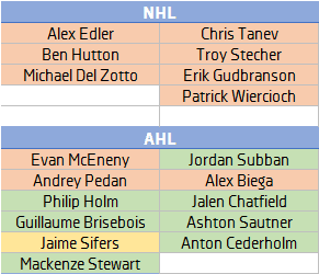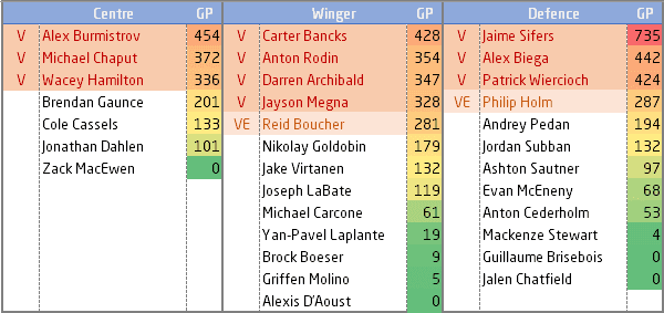 Then there are the forwards: Michael Chaput (372) and Jayson Megna (328) are likely to be squeezed out of the Canucks roster this season, while AHL contracted players Wacey Hamilton (336), Carter Bancks (428), and Darren Archibald (347) are all over the limit as well. What this means is that no more than five of Sifers, Biega, Chaput, Megna, Hamilton, Bancks, and Archibald can dress for any one game.