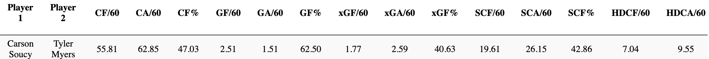 First, Myers’ numbers when paired up with Soucy, through 119:19 of 5v5 ice time with one another: