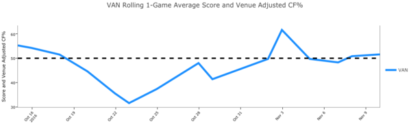 In the five games MacIntyre’s referencing, the Canucks held a lead for exactly 5:20. Here’s their score and venue adjusted Corsi For% on a per-game basis over the course of the season. They were a better territorial team in two of the losses MacIntyre is alluding to.
