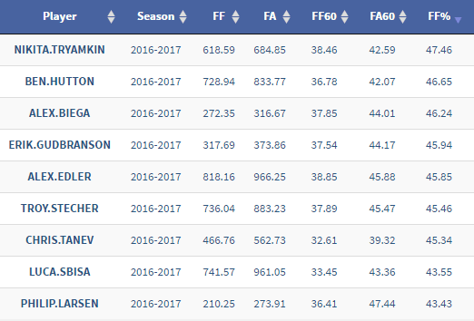 Even if the Canucks were afraid of Tryamkin not being able to maintain his underlying numbers if they increased his responsibility (we’re giving them the benefit of the doubt here and assuming that they were aware of how good his shot metrics were), surely they could have afforded to take the risk and see how he handled more minutes, when those minutes were being eaten by defenders with far worse numbers – including a clearly injured Chris Tanev and a clearly overplayed Alex Edler.