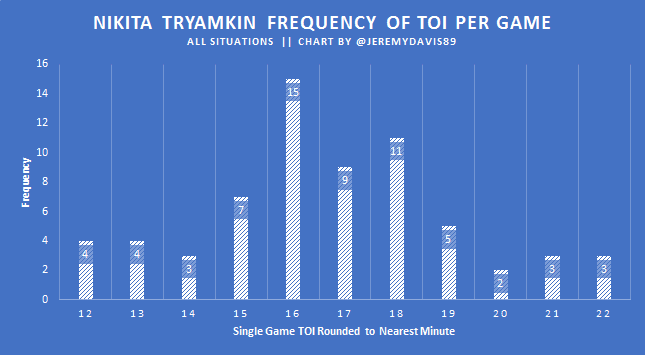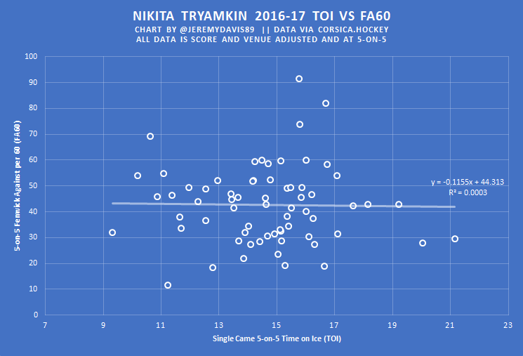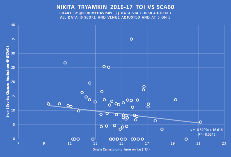 We can’t guarantee whether Tryamkin could have maintained his impressive shot suppression rates given a steady diet of top four ice time, but there is evidence that it should have at least been attempted, and evidence that we wasn’t being excessively boastful when stating that they could have played more minutes.