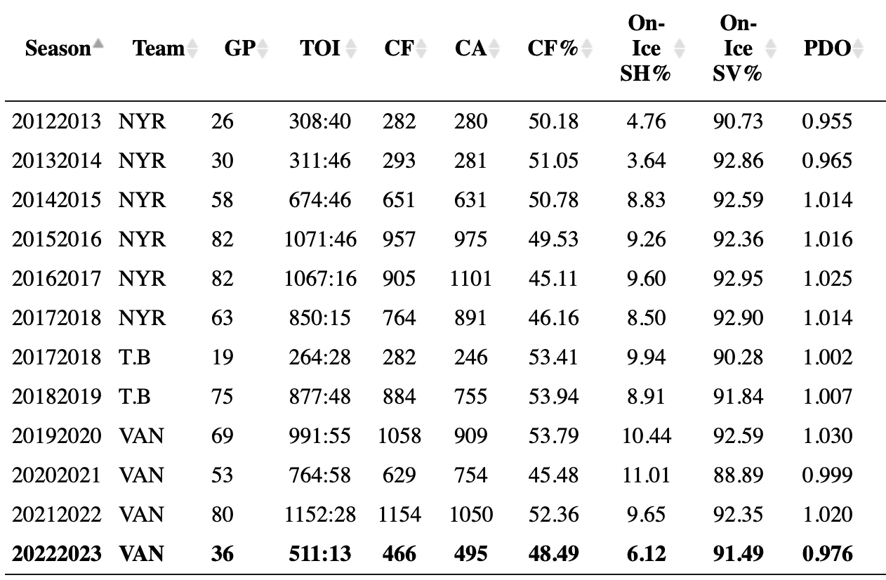 JT Miller career cross and on-ice advanced stats. (NaturalStatTrick)
