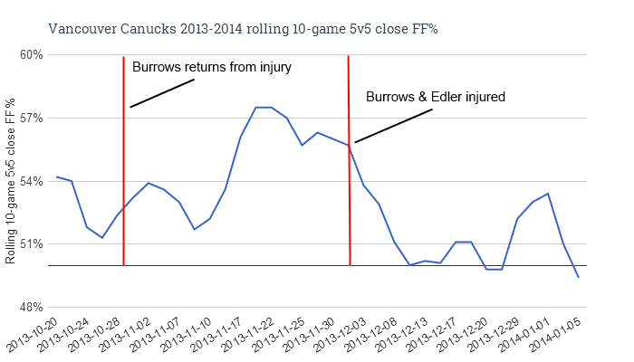 "Since Alex Burrows and Alex Edler have left due to injuries, the Canucks have been in an absolute nosedive. With both Burrows and Edler, they were among the elite play-driving teams in the NHL, and a player or two away from a legitimate Stanley Cup threat in my estimation. Now? Below average and probably not a playoff team."