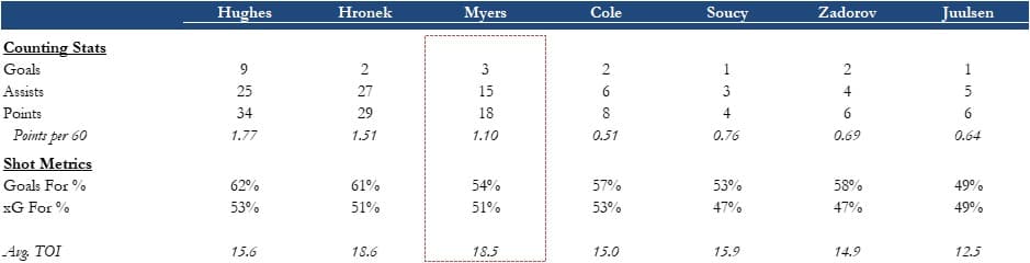 Two key developments this season have helped Myers settle into a more consistent second-pairing role. First, the emergence of the Hughes-Hronek pair as an elite play-driving duo capable of being deployed in critical moments and match-up minutes. Second, the club’s infinitely more reliable third pairing that the coaching staff has been able to roll out without bleeding chances against.