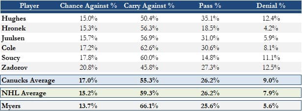 Hughes’ skating ability is clearly a separating factor that allows him to deny opposing zone entry attempts. At the same time, Soucy and Zadorov are big-bodied, sturdy skating defencemen who aren’t shy to use their physical attributes and sheer reach to prevent teams from gaining the Vancouver blueline. Ideally, you’d like to see Myers in this latter group, but it should be noted that Soucy and Zadorov are also commonly Myers’ defence partners. So it’s possible there is some noise in the data as, while Soucy and Zadorov are playing a tight gap, Myers is taking away the middle of the ice and readying himself for a retrieval should the opposing team opt for a dump-in attempt.
