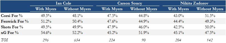 In these minutes, Myers has posted his most reliable two-way results with Cole. While both Cole and Soucy seem to benefit from playing with Myers vs. without, it’s worth noting that the Canucks have been out-muscled in shot metric terms when Myers has hit the ice with Soucy and Zadorov. Interestingly, Zadorov has fared better without Myers, given how his most frequent partner away from him is Noah Juulsen. Granted, those minutes have been somewhat sheltered and have typically come against weaker opposition.
