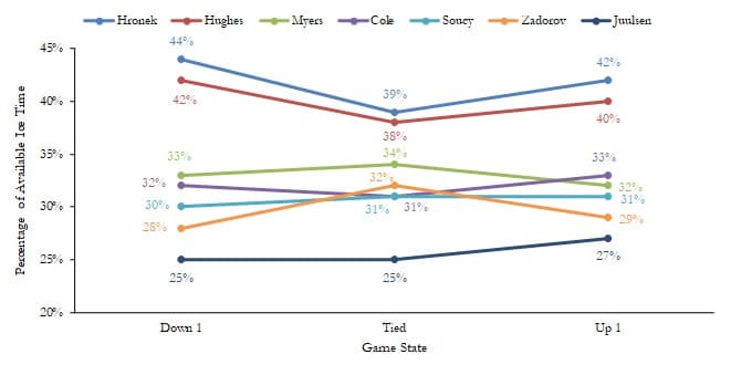 Beyond counting stats, it’s also helpful to understand how Myers has been deployed under Rick Tocchet and his coaching team. One way to measure the coaching staff’s trust in Myers is to understand his deployment in high-leverage, relatively-even game states (defined here as plus or minus one goal differential). Within these instances, Myers is the third most frequently used defender after Hughes and Hronek: