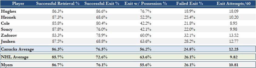 What’s interesting to note in this dataset is that the Canucks, on average, exit the defensive zone at a more proficient clip relative to league-average but do so with possession less often. This may be a reflection of Tocchet’s quick-up philosophy, which at times may include chipping pucks off the wall or deflection exits into the neutral zone for the forwards to chase onto.