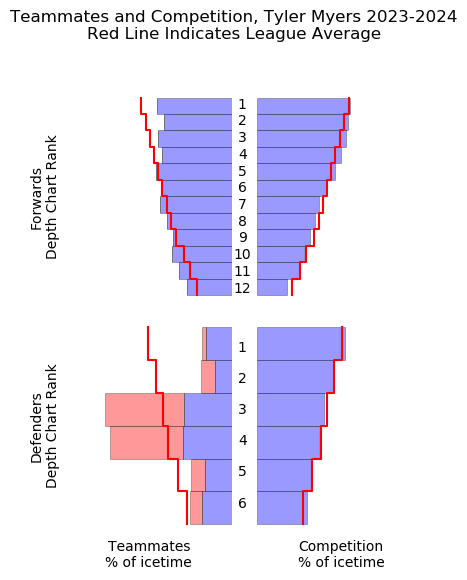 Myers has shared the ice with Ian Cole, Carson Soucy, and Nikita Zadorov as his most common defence partners, having spent over 200+ minutes with each player at 5-on-5. Regardless of his partner, Myers has been tasked with matching up against better-than-average competition without sharing the ice as frequently with Vancouver’s top forwards, as shown below: