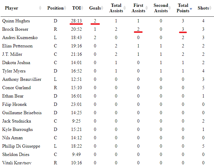 Some interesting notes from the stats include Quinn Hughes picking up two goals and an assist on the night. He led the Canucks in ice time with 28:13 on the night.