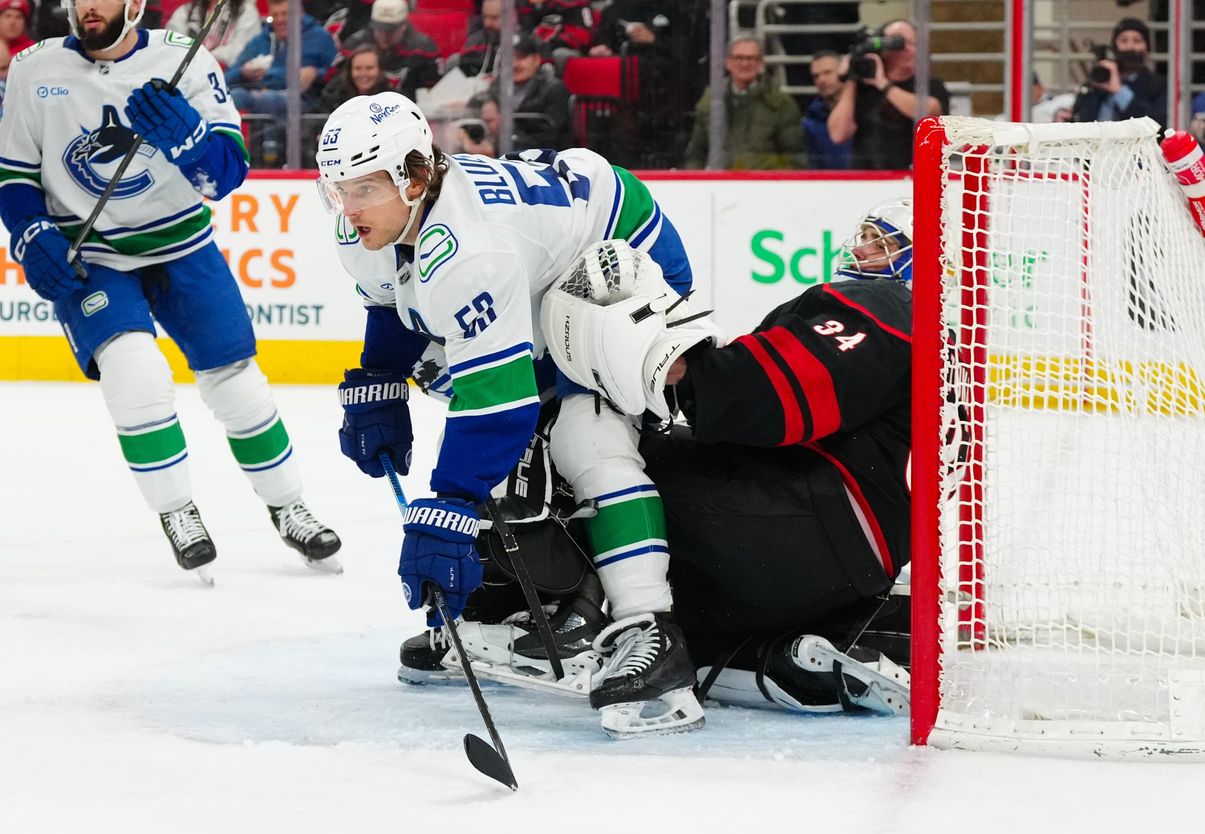 Back at 5v5, Miller made a poor decision with the puck, electing to put it blindly into the middle of the ice instead of up the boards, which led to Carolina getting a couple of shots off, the second of which beat Thatcher Demko five-hole.