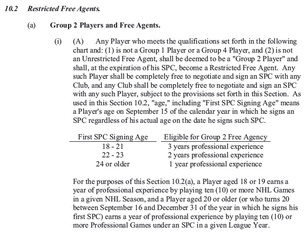 It has to do with a unique provision of the CBA that puts certain players in a bit of free agency limbo. Typically, when a young NHL player comes out of his ELC, he becomes a Group 2 Restricted Free Agent: