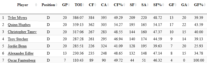 The Canucks have had at least a handful of games where they have been severely outshot and outplayed at even strength, which is reflected in the defence corps’ shot metrics and goal-differential over the past 20 games.