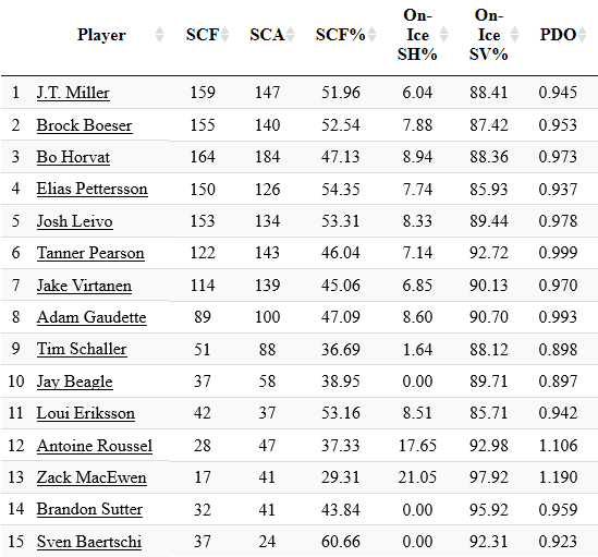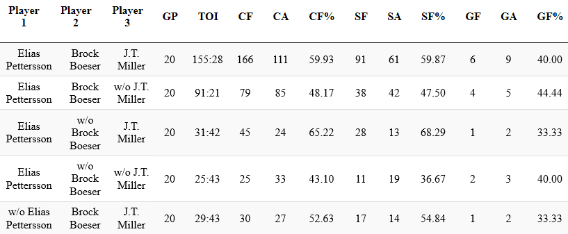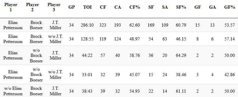 Right now JT Miller has played a lot with Pettersson and Boeser, after that it’s Horvat and whoever was on the other wing. JT Miller has drastically improved all these forwards ability to control the puck in the offensive zone and evacuate their own zone with ease.
