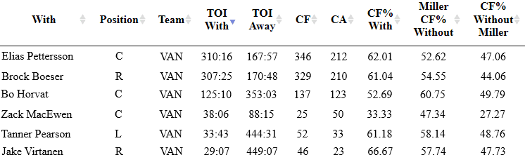 JT Miller is incredibly valuable for the team as it’s currently constructed. He can play with basically anyone on the roster and raise their Corsi percentage in the process. He even makes an already impressive player like Quinn Hughes almost 8% better when it comes to CF%. It’s up to the coach to use him correctly and JT Miller is a bigger key to this team than we could have ever imagined when the Canucks traded a 1st and 3rd round pick for him at the draft.