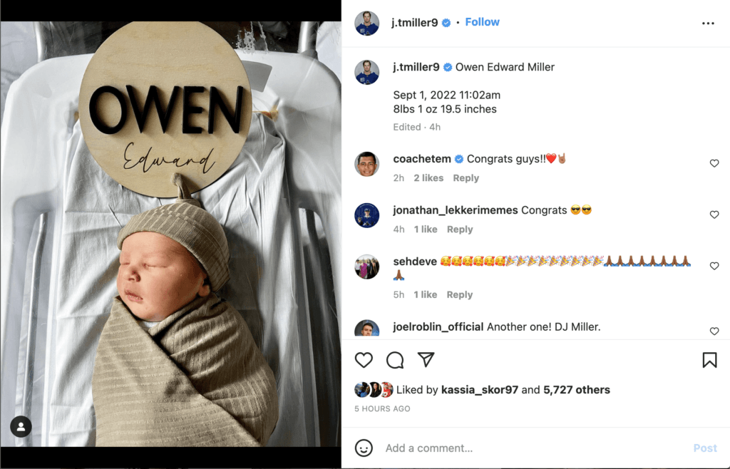 Former Canucks and Anaheim Ducks forward Emerson Etem was among those who shared congratulations to the Millers on Instagram. Etem played with J.T. on Team USA at the 2012 IIHF World Junior Championship.