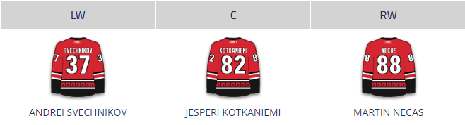 The trio of Svechnikov, Necas, and Jesperi Kotkaniemi have a 67.54% Corsi percentage, a 69.26% control of expected goals, have created 36 scoring chances while only giving up 17, and have been on the ice for five goals scored and are yet to be on the ice for a goal against.