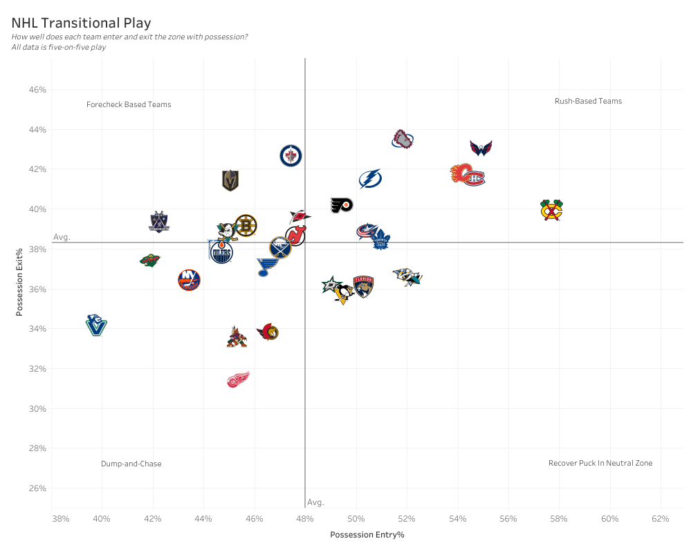 The Lightning were a very heavy and fast-paced team last season, they had the skilled players that could exit the zone cleanly and then help their team retain possession all the way into the offensive area. The Canucks, on the other hand, were dead last by an extremely wide margin when it came to entering the offensive zone with possession. They were also one of the worst teams when it came to exiting their own zone.