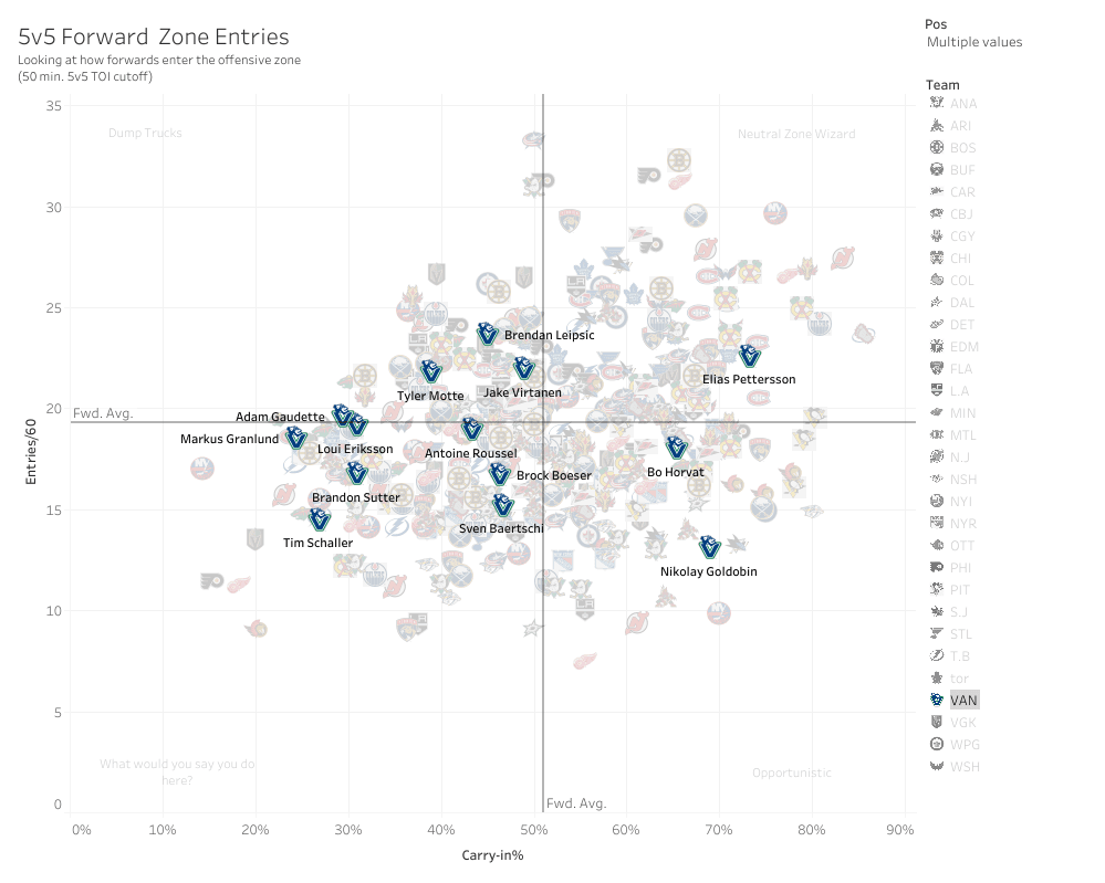 Compared to last year’s Canucks, Miller will be a welcome addition when it comes to entering the zone. He still had the highest number of entries per hour, while only three Canucks this past season had a higher carry-in percentage.